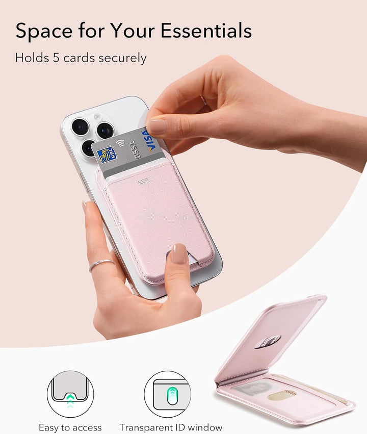 - Mayor almacenamiento de tarjetas inteligentes: la cartera Magsafe de ESR para mujer tiene capacidad para 5 tarjetas y algunos billetes de forma segura con 3 ranuras individuales para tarjetas, incluyendo una ventana de identificación transparente y una ranura ovalada de 0.78 pulgadas para un fácil acceso