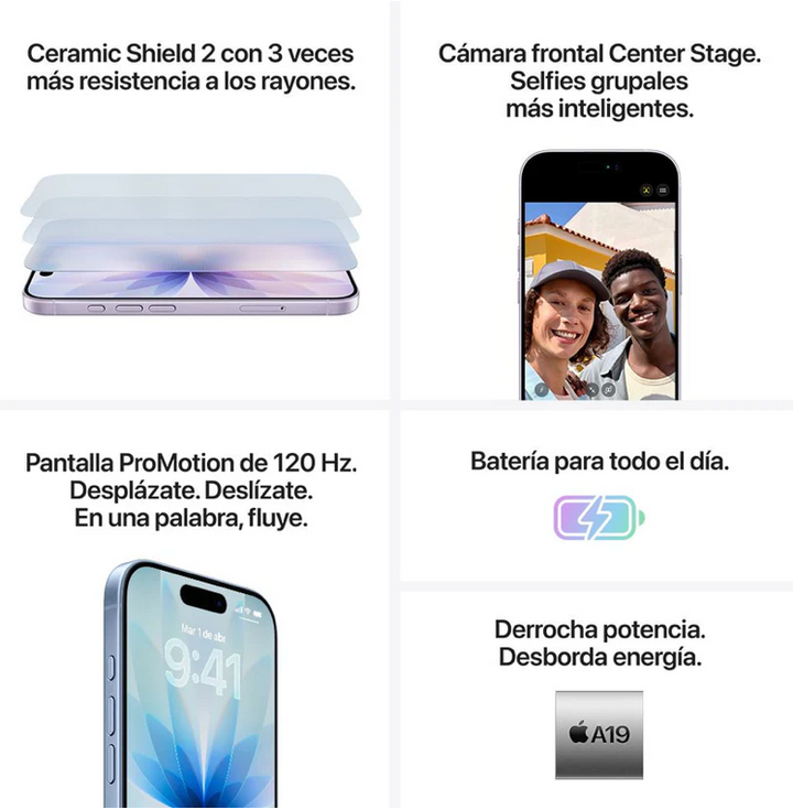Descubre el iPhone 17: con pantalla OLED Super Retina XDR de 6,3″ y tasa de refresco ProMotion de 120 Hz, chip A19 de última generación, doble cámara trasera de 48 MP, cámara frontal de 18 MP y conectividad de alta velocidad (Wi-Fi 7, 5G). Todo ello con diseño elegante y memoria base de 256 GB. Ideal para quienes demandan lo máximo en rendimiento, foto/vídeo y durabilidad.