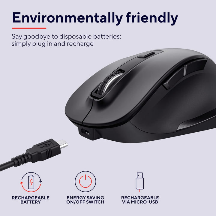 El Trust Fyda combina rendimiento y sostenibilidad con su diseño ergonómico y batería recargable integrada. Ofrece conexión inalámbrica estable de hasta 10 m, botón de selección de velocidad (DPI) y funcionamiento silencioso. Fabricado con materiales reciclados, ideal para uso profesional o doméstico.