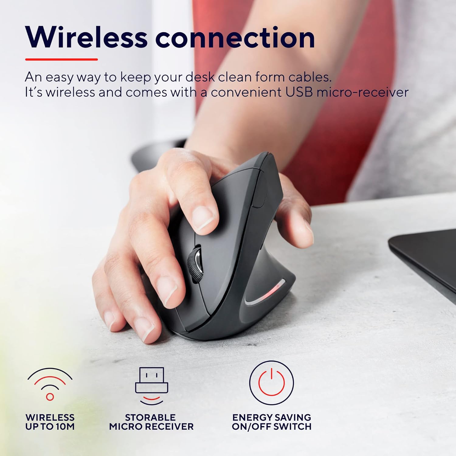 Diseñado para brindar máxima comodidad, el Trust Verto Ergonomic Wireless Mouse reduce la tensión en el brazo y la muñeca gracias a su forma ergonómica vertical. Ofrece conexión inalámbrica estable de 10 m, botones laterales de acceso rápido y selector de velocidad para un control preciso. Ideal para largas jornadas de trabajo o estudio.